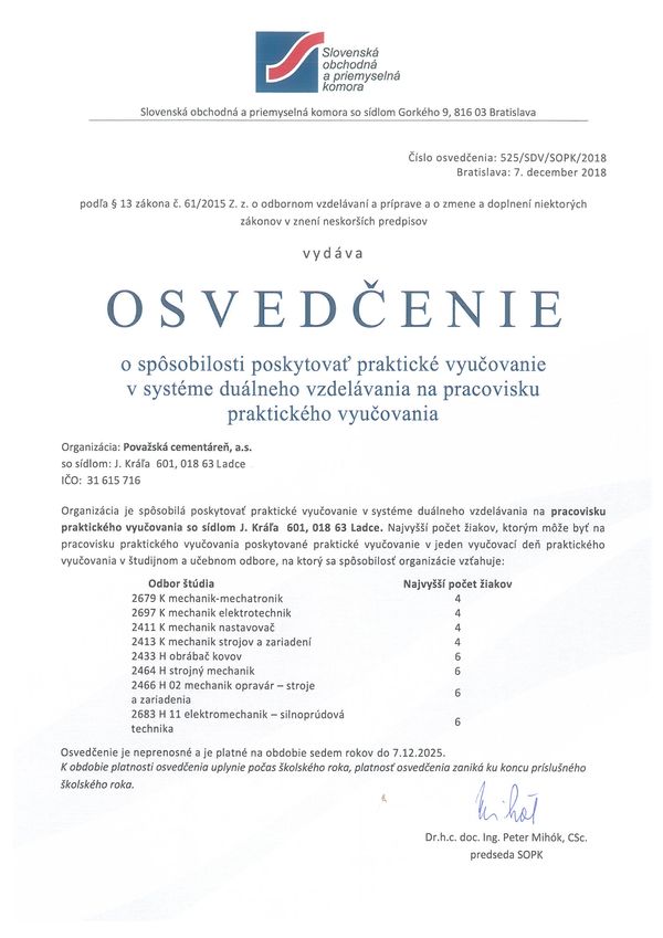 Kvalita, odbornosť, lojalita a tradícia celoživotného zamestnania pracovníkov sú základnými hodnotami našej spoločnosti. V minulosti bola naša organizácia pevne previazaná s výchovou a vzdelávaním mladých učňov. Preto sme sa rozhodli opäť vstúpiť do systému odborného vzdelávania prostredníctvom praktického vyučovania. Spoločnosť Považská cementáreň je od roku 2019 držiteľom osvedčenia o spôsobilosti poskytovať praktické vyučovanie v systéme duálneho vzdelávania.