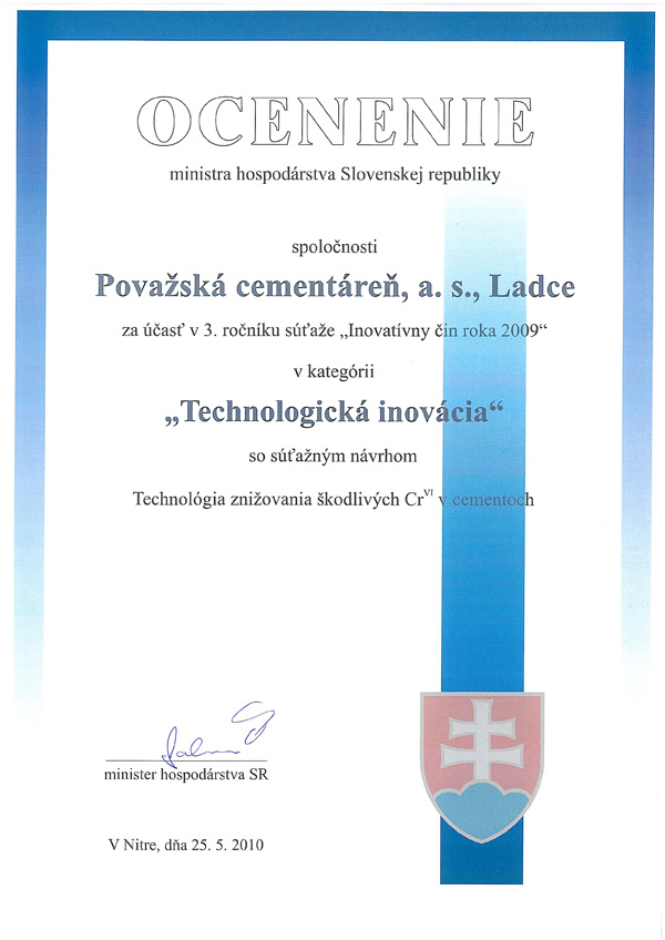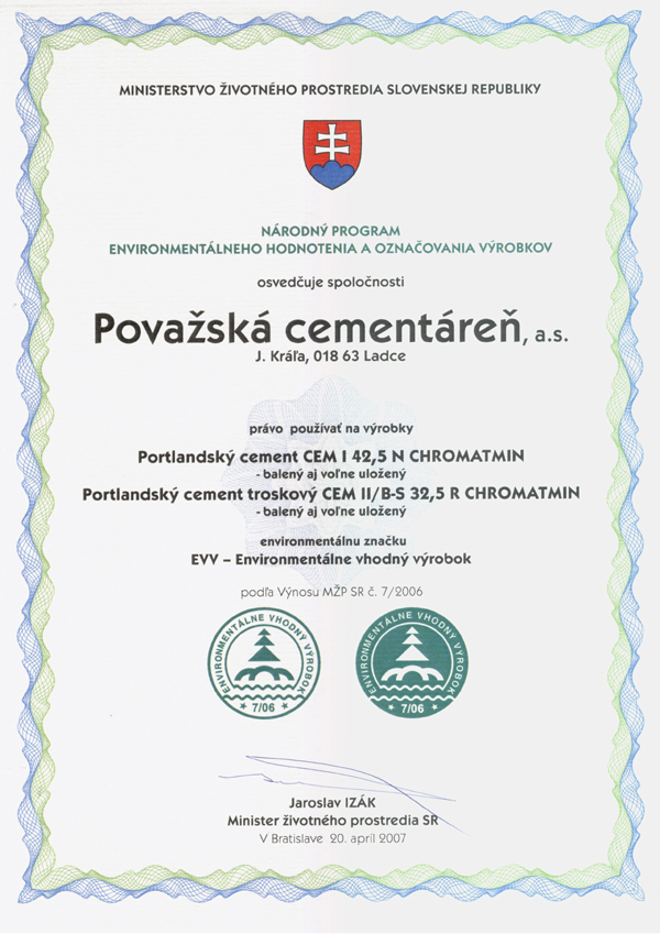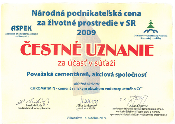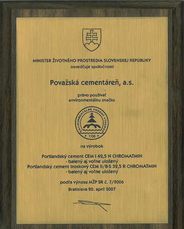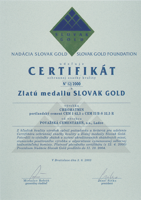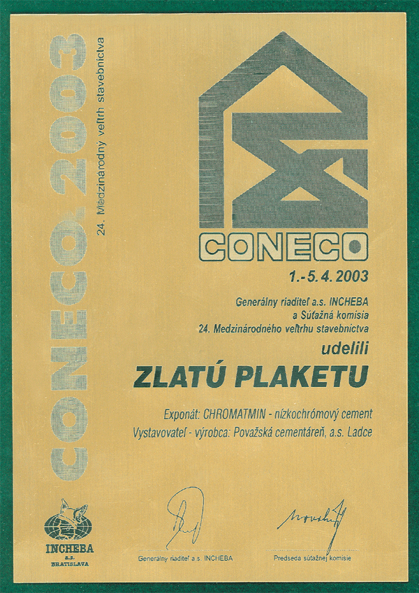 - v roku 2005 – nízkochrómový cement CHROMATMIN