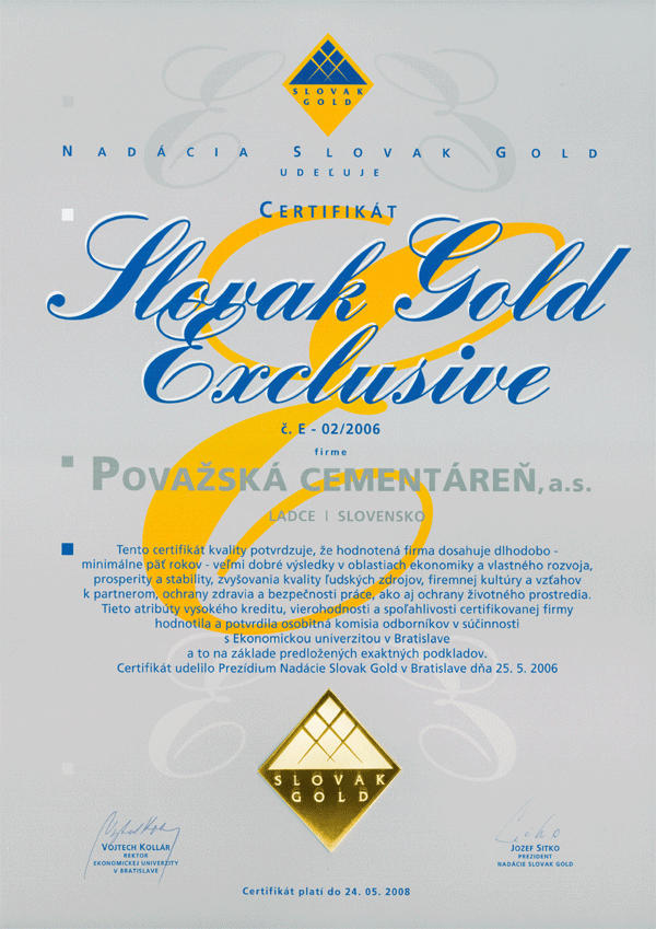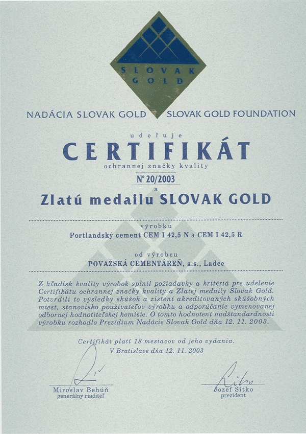Ocenenie kvality certifikátom ochrannej znacky a Zlatou medailou SLOVAK GOLD