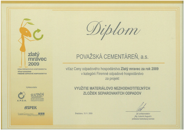 Ocenenie ZLATÝ MRAVEC - za firemné odpadové hospodárstvo