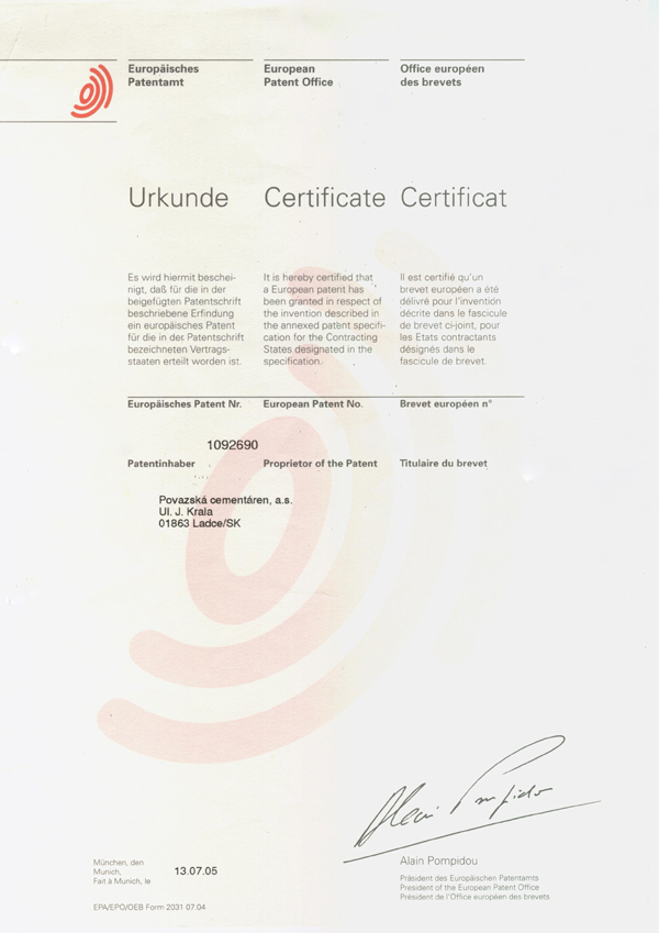 O význame tejto investície svedčí aj udelenie európskeho patentu za „Spôsob výroby nízkochrómového cementu technológiou vyvinutou spoločnosťou Považská cementáreň, a.s., Ladce“ v roku 2005. Vďaka vývinu novej technológie nie je spoločnosť priamo závislá na dodávateľoch redukčných prísad a dokáže tak významne znížiť svoje náklady.